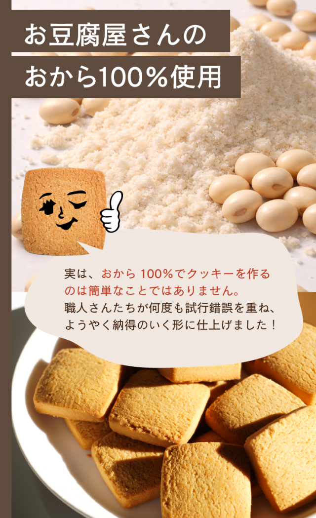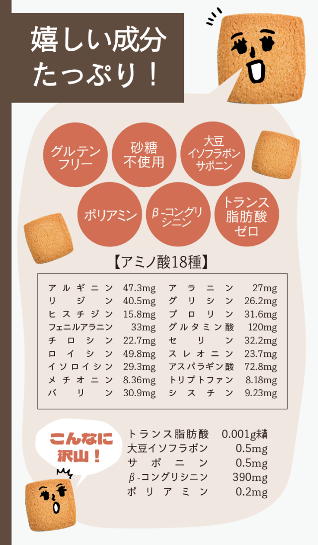 ■原材料:おから乾燥粉末(国内製造)、てんさい糖、ショートニング、豆乳、アーモンド、食塩/膨張剤、(一部に大豆・アーモンドを含む)