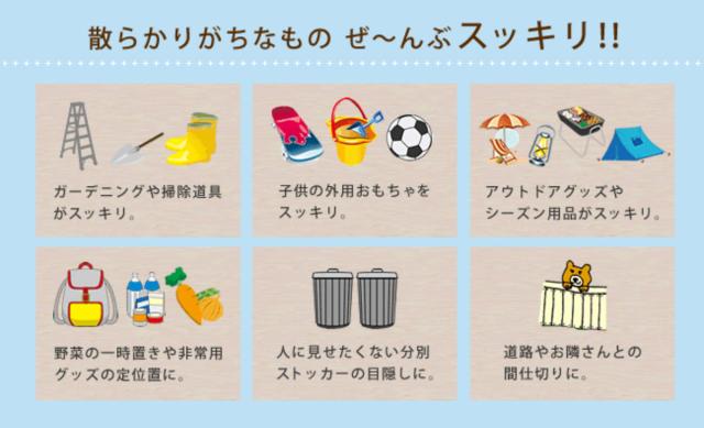 ガーデニング用品、お掃除グッズ、お子様の外用おもちゃ、アウトドアグッズ等をまとめて収納できます。見た目以上に収納力があるので、お庭がスッキリと片付きます。