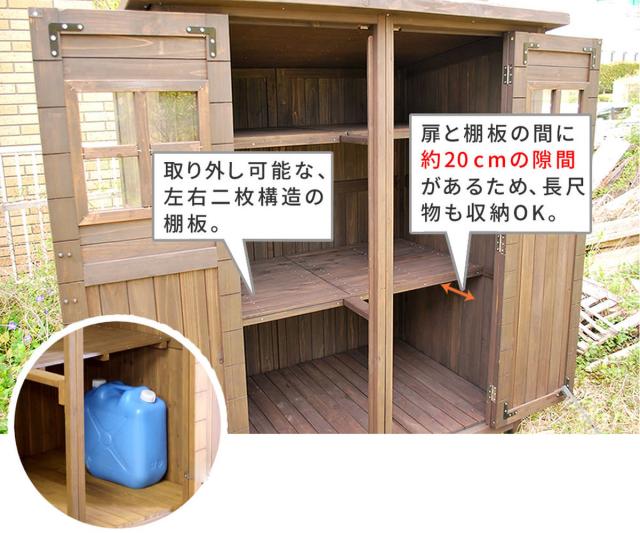 棚板は左右二枚分割式です。収納に合わせて自由に取り外すことができるので、ホウキやデッキブラシ、園芸用の支柱など、長さのあるものも収納できます。また、左右の収納部の間に仕切りがないため、横幅を広く使用して収納することもできます。