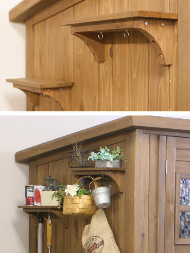 フック付き吊り棚が2個付属しており、お好きな場所に取り付けてお使いいただけます。雑貨を置いたり、ほうきを引っ掛けたり可愛く便利にアレンジできます。