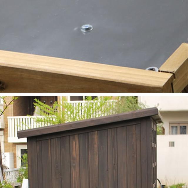 天板は雨風に強いPVC材を使用しています。後ろ下がりに作られており、雨水が溜まらずに流れ落ちる仕様です。