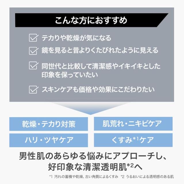 ●男性の肌悩みトップの乾燥&テカリ対策に加えて、ニキビ・肌荒れ予防にもアプローチするメンズスキンケアシリーズ。
