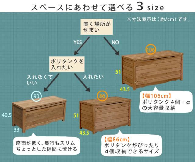 ![]() ポリタンク×4個がピッタリ ●幅86cm 天然木 | ![]() ポリタンク×4個が余裕で入る ●幅106cm 天然木 | ![]() 座面高が低く、スリム ●幅90cm |