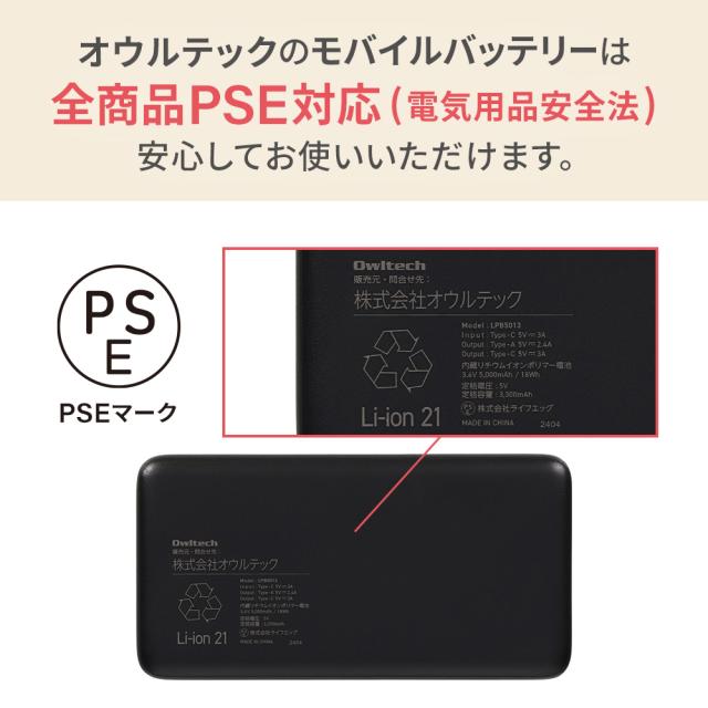 モバイルバッテリー タイプA出力 5000mAh 急速充電 持ち歩き 旅行 トラベル スマホ アイフォン iPhone スマートフォン タブレット 保護 同時充電 owltech オウルテック おうるてっく