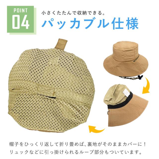 帽子をひっくり返して折り畳めば、裏地のメッシュがそのままカバーになるパッカブル仕様