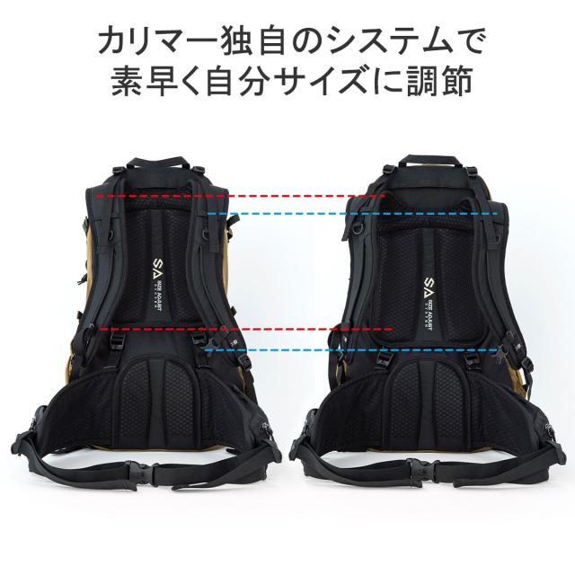背面長の調整が可能なシステムを搭載した、中型リュックサックです。背負ったまま背面の調整が可能なため、素早いフィッティングやシーンに応じたアジャストを可能にします。登山やアウトドアに特化した嬉しいポケットや機能も満載で、性別や体格・場面にとらわれず、山行を快適にサポートするアイテムに仕上がっています。