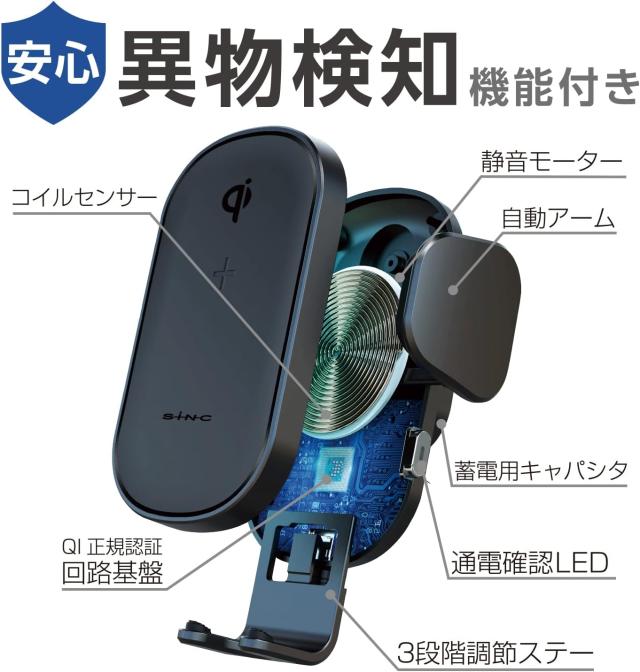 ●自動でアームが可動し、Qi正規認証ワイヤレス充電機能内蔵の車載携帯電話ホルダーです。