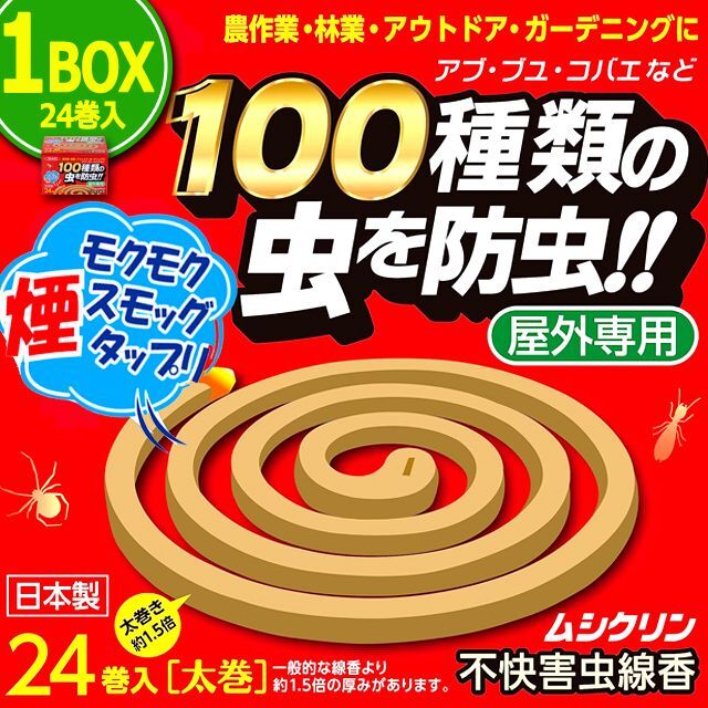 1箱 24個 不快害虫線香 カメムシ 駆除(屋外専用 ムシクリン100種類の虫を防虫する強力有効成分配合線香 24巻 1BOX] 虫除け 防虫 網戸 アウトドア 庭仕事