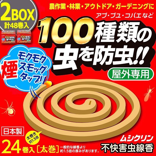 2箱 48個 不快害虫線香 カメムシ 駆除(屋外専用 ムシクリン100種類の虫を防虫する強力有効成分配合線香 48巻 2BOX] 虫除け 防虫 網戸 アウトドア 庭仕事