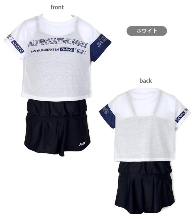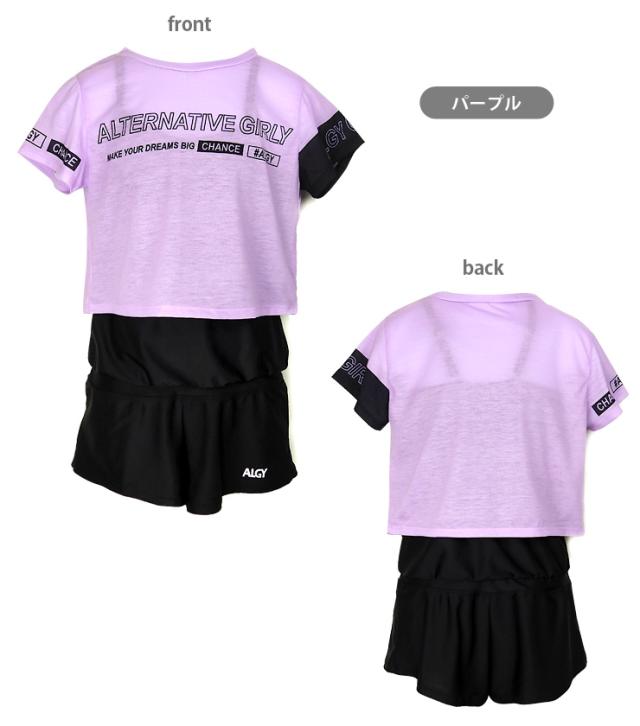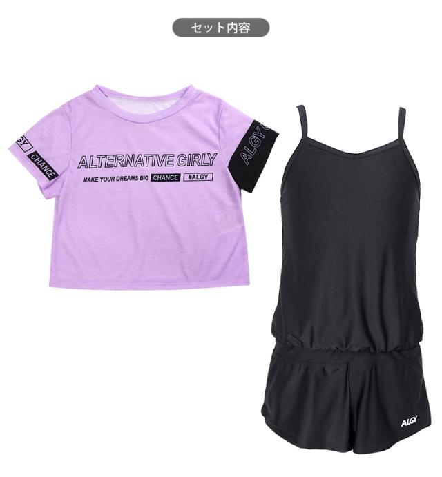 ALGY ワンピーススクール水着セット キッズ ジュニア 女の子 130 140 150 160 170 アルジー ホワイト パープル 33251371 2点セットアップ Tシャツ カバーアップ トップス ショートパンツ 短パン ネームタグ 白 紫 紺 黒 ネイビー ブラック メール便送料無料 sw3504