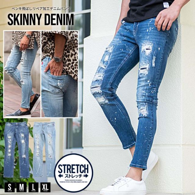 デニムパンツ メンズ ブランド おしゃれ スキニーパンツ デニム パンツ スキニーデニム ジーンズ Gパン テーパードパンツ ブリーチ ペンキ飛ばし リペア加工 細身 スリム タイト ストレッチ 伸縮性 ブルー S M L XL LL CavariA 服 男 男性 春 夏 即日発送 [CANG24-50]
