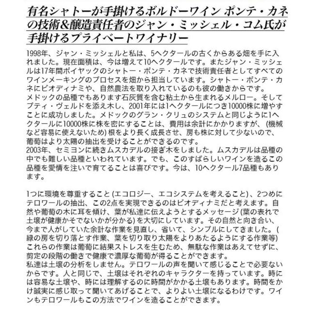 シャトー・ポンテ・カネで元醸造長を務めたジャン・ミッシェル・コム氏が所有するシャトー。株密度1万株、ビオディナミ(認証なし)で栽培するなど、ポンテ・カネと同じ栽培、醸造方法を実践しています。デメテールの認証もあえて取得せず、自然を最大限に生かすことを目的としたワイン造りを行っています。(有機栽培としてエコセールの認定はあり)