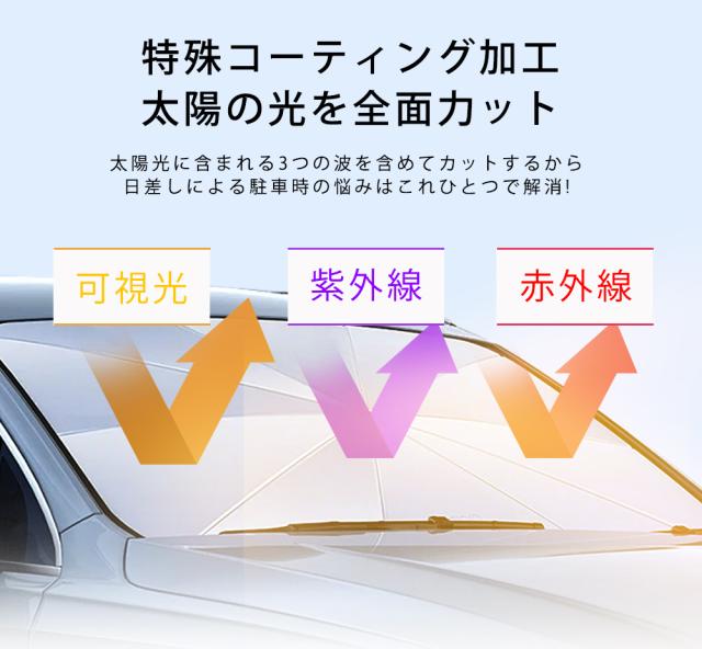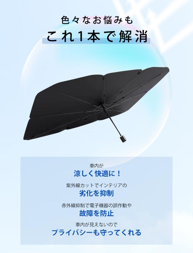 2サイズ選択可能で99%の車のフロントガラスに対応できます。軽自動車、ビジネス車、SUV、MPVなどの中大型車もコンパクトカー、スポーツカーなどの小型車も使用できます。普段駐車時の日除け用だけでなく、車中泊や仮眠時にプライバシーの保護に役に立てます。雨の日に傘を忘れた時本製品も仮の傘として使用でき、炎天下でも仮の日傘として使われます。