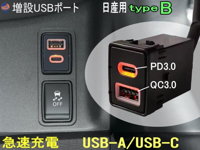 日産車用 USB充電ポート タイプB 【メール便 送料無料】 増設ポート 急速充電 USB-A QC3.0 USB-typeC PD3.0 タイプC スイッチホールパネル USB電源 充電ポート ニッサン用 セレナ エクストレイル ジューク ティアナ ノート リーフ USBポート 後付け 純正風 車で充電