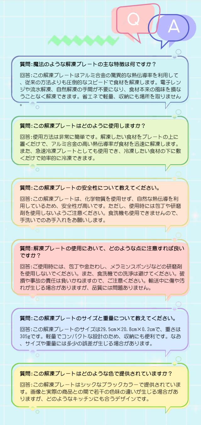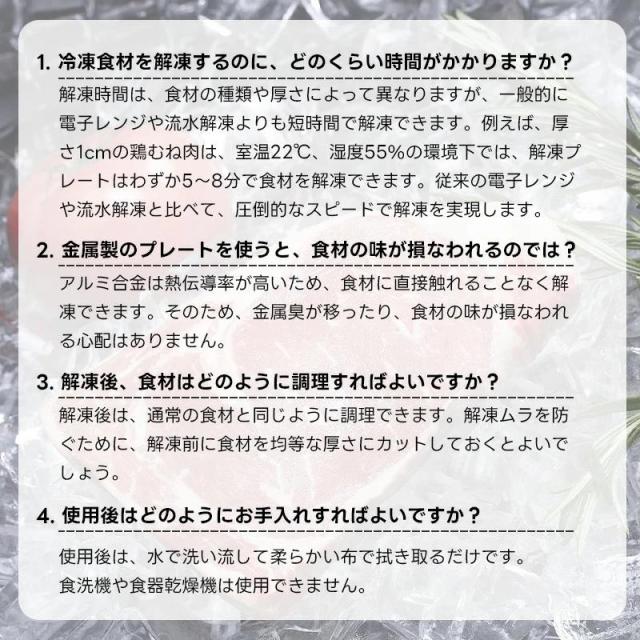 | Q: 魔法のような解凍プレートの主な特徴は何ですか? A: この解凍プレートはアルミ合金の驚異的な熱伝導率を利用して、従来の方法よりも圧倒的なスピードで食材を解凍します。電子レンジや流水解凍、自然解凍の手間が不要になり、食材本来の風味を損なうことなく解凍できます。省エネで軽量、収納にも場所を取りません。 Q: この解凍プレートはどのように使用しますか? A: 使用方法は非常に簡単です。解凍したい食材をプレートの上に置くだけで、アルミ合金の高い熱伝導率が食材を迅速に解凍します。また、急速冷凍プレートとしても使用でき、冷凍したい食材の下に敷くだけで効率的に冷凍できます。 Q: この解凍プレートの安全性について教えてください。 A: この解凍プレートは、化学物質を使用せず、自然な熱伝導を利用しているため、安全性が高いです。ただし、使用時には包丁や研磨剤を使用しないようご注意ください。食洗機も使用できませんので、手洗いでのお手入れをお願いします。 Q: 解凍プレートの使用において、どのような点に注意すれば良いですか? A: ご使用時には、包丁や金たわし、メラミンスポンジなどの研磨剤を使用しないでください。また、食洗機での洗浄は避けてください。破損や事故の責任は負いかねますので、ご注意ください。輸送中に傷や汚れが生じる場合がありますが、品質には問題ありません。 Q: この解凍プレートのサイズと重量について教えてください。 A: この解凍プレートのサイズは29.5cm×20.8cm×0.2cmで、重さは305gです。軽量でコンパクトな設計のため、収納にも便利です。なお、サイズや重量には多少の誤差が生じる場合があります。 Q: この解凍プレートはどのような色で提供されていますか? A: この解凍プレートはシックなブラックカラーで提供されています。画像と実際の商品との間で若干の色味の違いが生じる場合がありますが、どのようなキッチンにも合うデザインです。 | ||||||