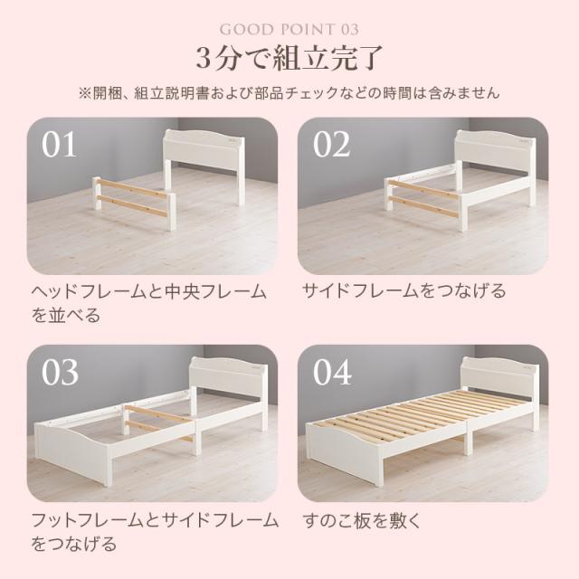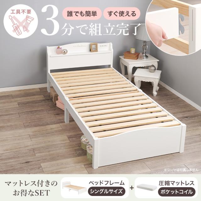 ベッド マットレス付き シングル すのこベッド マットレスセット 可愛い 姫系 家具 宮付き 簡単 組立 工具不要 白 ポケットコイル ネジレス プリンセスベッド コンセント付き 宮棚 おしゃれ 一人暮らし