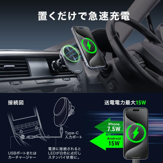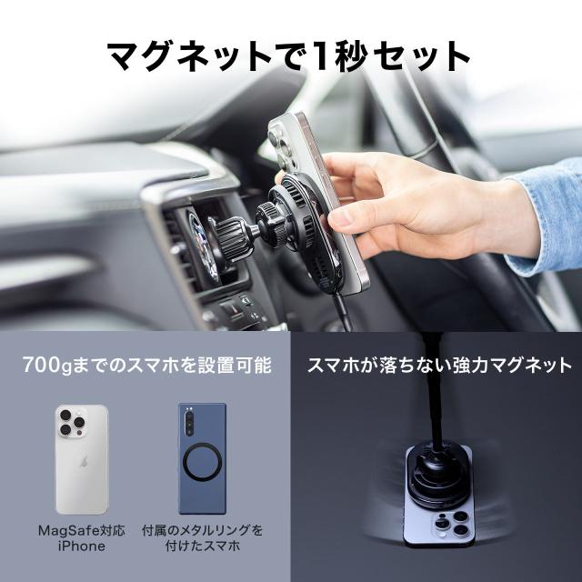 車載ホルダー ワイヤレス充電対応 半導体冷却機能 ペルチェ素子 マグネット 磁気吸着 スマホホルダー 車 エアコン吹き出し口 片手操作 iPhone Android 急速充電 メタルリング付属[200-CAR109]