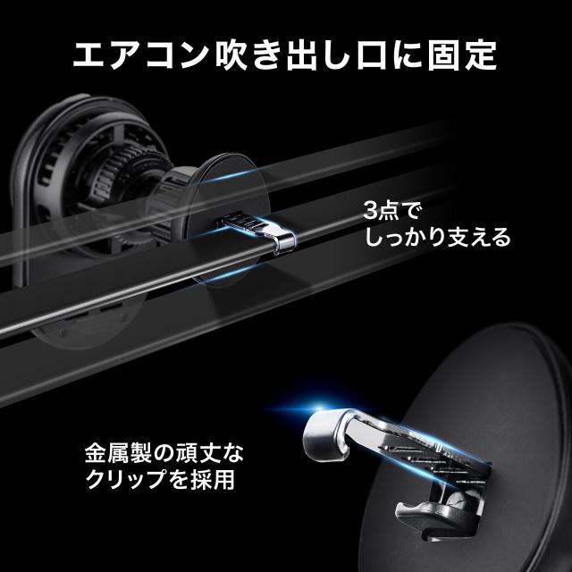 ※マグネットで強力固定しますので、エアコンルーバー側が破損しないよう、スマートフォンを取外しの際はホルダーを抑えながら取り外してください。