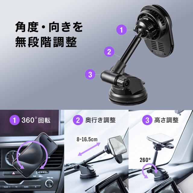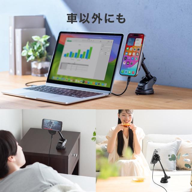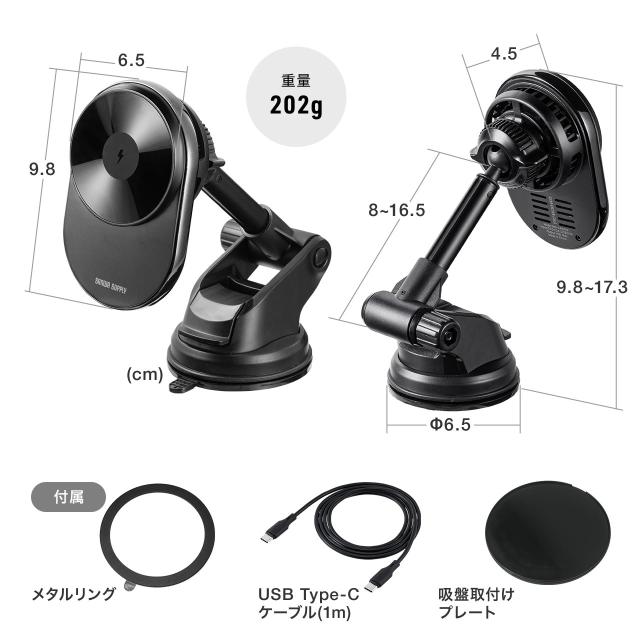 ■対応車種:吸盤部が貼り付くW6.5×D7.5cm以上の平滑で水平な場所がある車種■対応機器:MagSafe対応iPhone、または付属のメタルリングを貼り付け可能な700g以下のスマートフォン