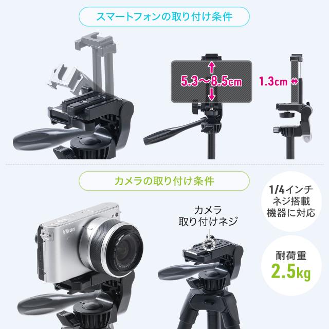 ●一眼レフカメラやミラーレスカメラ、ビデオカメラ、デジタルカメラ、スマートフォンも設置できる兼用の三脚です。