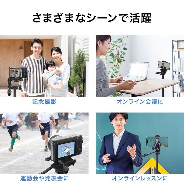 ●スマホホルダーが一体になったコンパクトなマルチ三脚です。●4段階の伸縮が可能で、最低41cmから最高138cmまで高さ調節が可能です。