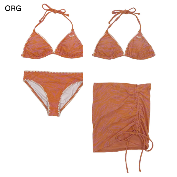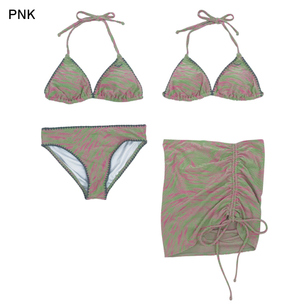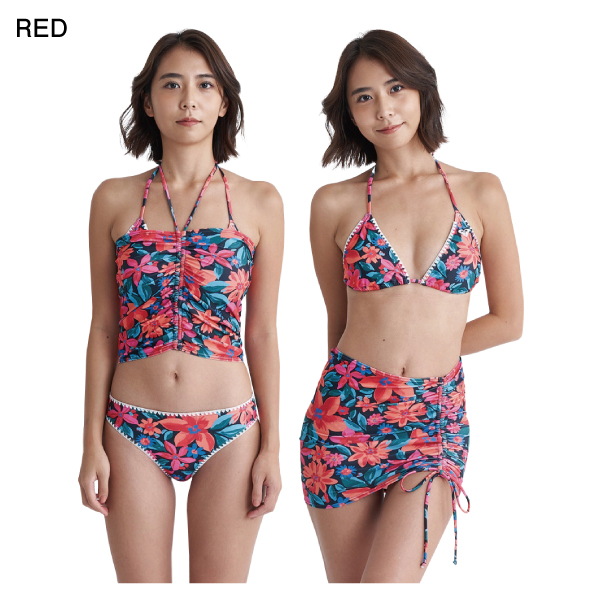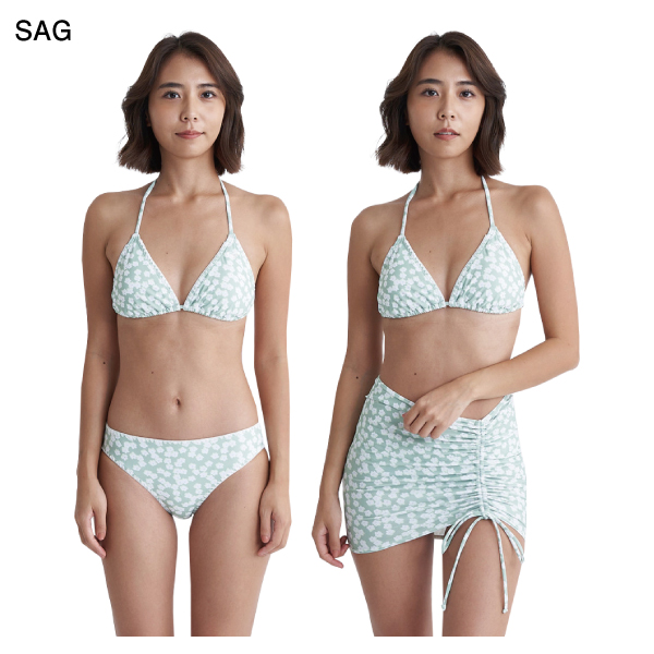 | | シェルステッチをあしらってクラフト感をプラスした三角ブラと、小さめショーツ、マルチウェイスカートの3点セット。スカートにはドローコードがついているので、着丈の調節ができたり、ベアトップ、ホルターネックにもなる4WAY仕様。シーズナルのプリントを含む豊富なカラー展開なのでお気に入りの1枚が見つかります。 |