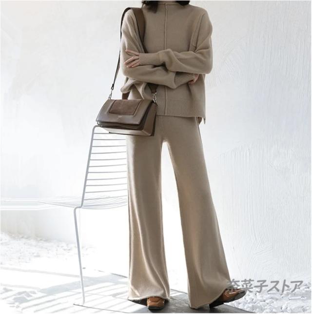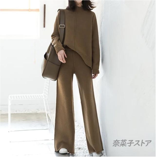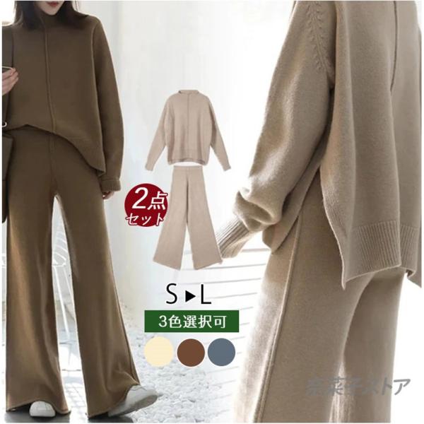 ニット上下セット ニットセーター 2点セット レディースパンツ 長袖 一部即納 ゆったり ワイドパンツ 冬 春 秋 30代 40代 50代 スリット