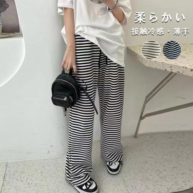 ワイドパンツ プリントイージーパンツ ボーダー柄 リラックスパンツ レディース カジュアル 接触冷感 ひんやり 涼しい 薄手 夏用 ルームウェア