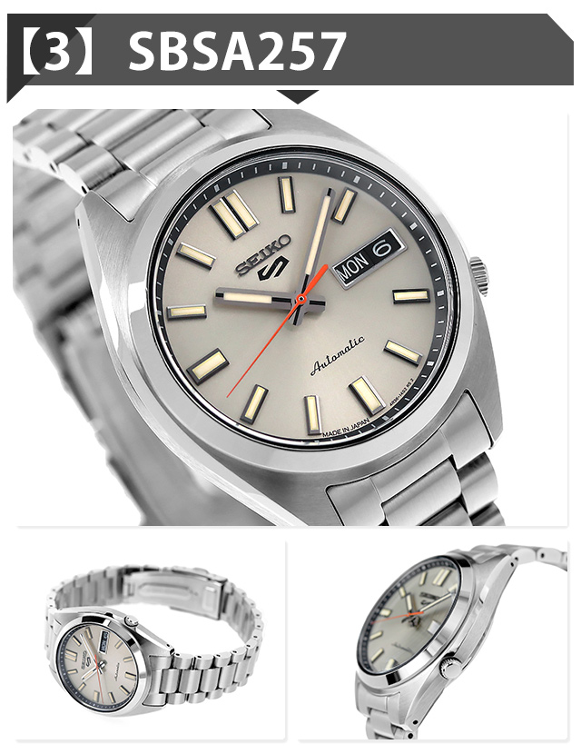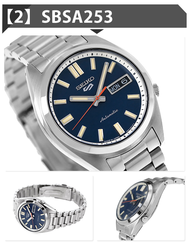 正規品 7年保証キャンペーン 送料無料 セイコー5 スポーツ 日本製 メンズ 腕時計 Seiko 5 Sports SNXS Sports Style アナログ ブルー ブラック ゴールド 選べるモデル ◆ファンから人気の高い旧セイコー5のSNXSデザインを5Sportsのスタンダードモデルとして正統進化。オリジナルのデザインを踏襲しつつも、高い質感を感じさせる外装へブラッシュアップ。クラシックなデザインに合う片側球面ガラスを採用。ケースはオリジナルからカン足の重心を下げ、側面を筋目と鏡面の仕上げ分けによるメリハリを付けることで腕馴染みが良く美しい、クラシカルな造形に。ダイヤル、針はより高級感を持たせつつも視認性が格段に向上。デザインテーマは「CLASSIC SPORTS SERIES」。1970年代以降5スポーツで展開していたモデルは、オレンジ秒針やスポーティーなダイアルカラーが特徴。レトロクラシックな世界観を演出します。 発売日:2024年5月発売 SBSA255 SBSA253 SBSA257 機械式腕時計