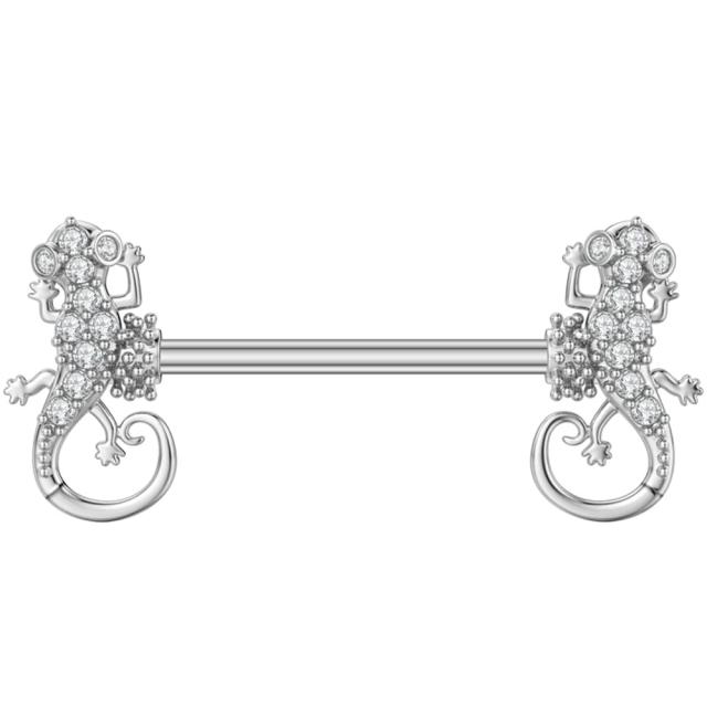 14ゲージのストレートバーベルの両側にキラキラのクリスタルのキュービックジルコニアを散りばめたトカゲをデザインしたニップルやヘリックスにオススメのボディピアス。