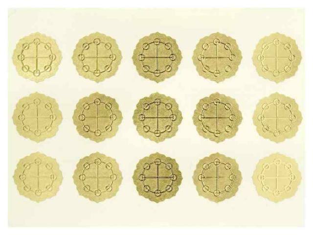 シールの直径は、約20mm。15枚入りです。縁取りは、やたのかがみをモチーフにしています。