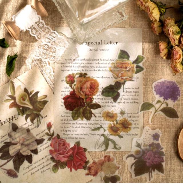大きめ 60枚 硫酸紙 海外ステッカー 海外シール カラー別 手帳デコ デコレーション素材 アイテム アレンジ コラージュ 素材 ジャンクジャーナル モノクロ モノトーン 花 ローズ 薔薇 半透明レトロ 紫色 青色 おしゃれ トレーシングペーパー スマホ 飾り diy DIY