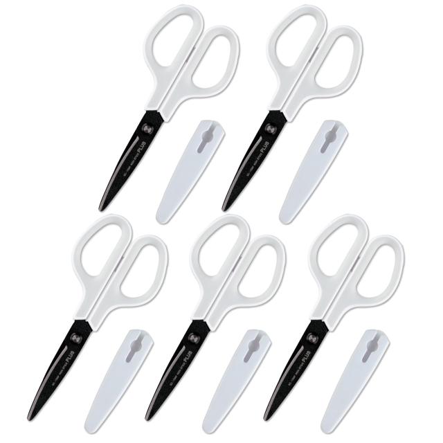 ◆商品名:プラス はさみ フィットカットカーブ フッ素コート 5本セット 粘着テープ のり ベタつかない 30度 SC-175SF ホワイト/グレー 34-515 ×5