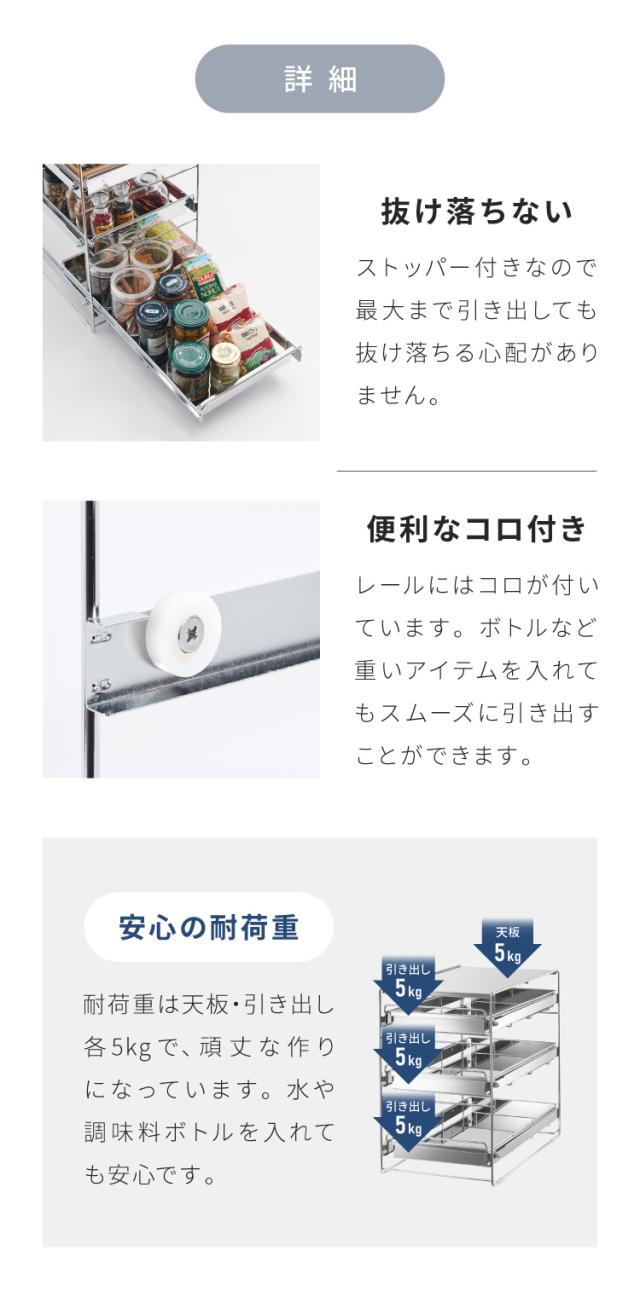 シンク下収納、キッチン収納、アイデア収納、すき間収納、隙間収納、シンク下、スライド収納、収納バスケット、調味料ラック、スパイスラック、ボトルラック、ストッカー、棚、ラック、洗面台下、コンロ下、鍋、なべ、フライパン