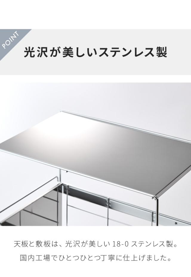 天板・敷板は美しい光沢のステンレス製で、水周りでもサビにくくお手入れ簡単です。