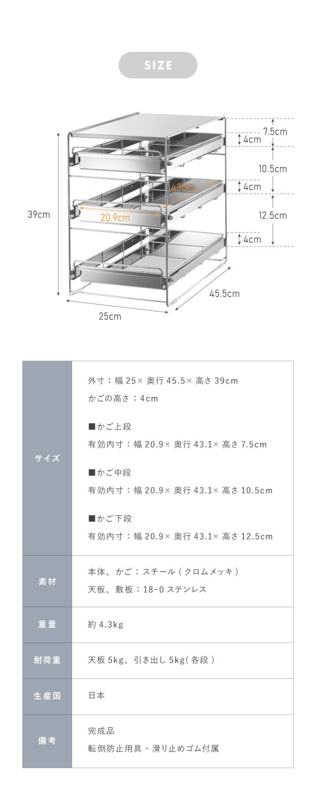 かご有効内寸:[上段]幅20.9×奥行43.1×高さ7.5cm、[中段]幅20.9×奥行43.1×高さ10.5cm、[下段]幅20.9×奥行43.1×高さ12.5cm