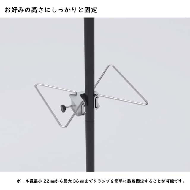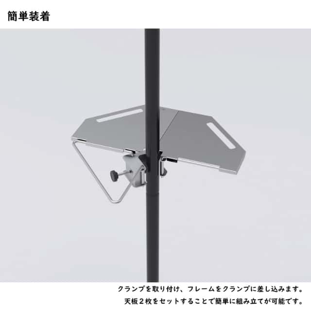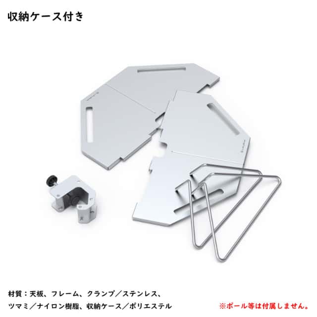 【商品仕様】 ・サイズ:400x400x63mm(組立時)/400x210x63mm(収納時) ・ポール径:φ22mm〜φ36mmまで対応 ・材質:天板、フレーム、クランプ/ステンレス、ツマミ/ナイロン樹脂、収納ケース/ポリエステル ・耐荷重:10kg ・重量:約1.6kg 【生産国】 ・MADE IN JAPAN 【お取り扱い・お手入れ方法】 ・使用後は汚れや水分などよく取り除いて保管してください。 ・保管する際は、直射日光を避け、風通しのいい場所で保管してください。 |