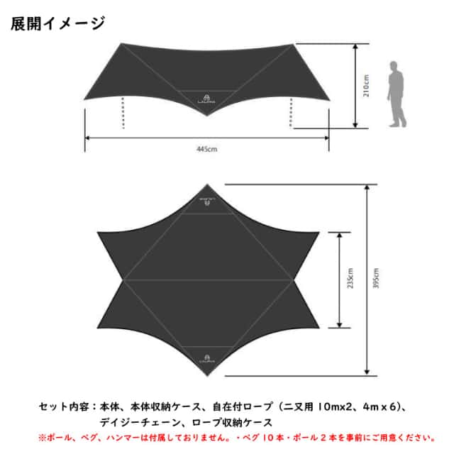 【商品仕様】 ・サイズ:約(W)445×(D)395×(H)210cm(展開時) 約(W)65×(D)20×(H)15 cm(収納時) ・材質:ポリコットン(ポリエステル65%・コットン35%) ・耐水圧:350mm ・総重量:約4.0kg 【セット内容】 ・本体、本体収納ケース、自在付ロープ(二又用10mx2、4mx6)、デイジーチェーン、ロープ収納ケース ※ポール、ペグ、ハンマーは付属しておりません。 以下の必要本数を事前にご用意ください。 ・ペグ10本・ポール2本 【生産国】 ・MADE IN CHINA 【お取り扱い・お手入れ方法】 ・使用後は汚れや水分などよく取り除いて保管してください。 ・保管する際は、直射日光を避け、風通しのいい場所で保管してください。 |