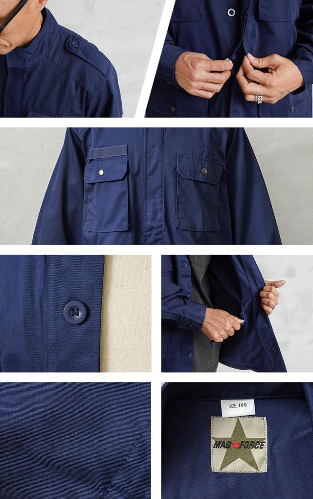 素材にはコットンポリやT/Cと呼ばれるコットンとポリエステルの混紡素材が使用されています。綾織りされたハリのある丈夫で汚れにくいT/Cツイル生地は速乾性に優れ、シワになりにくく、タフでイージーケアが可能!スタンドカラーや個性的なディテールが際立つ、洗練された印象のコンバットジャケットです!
