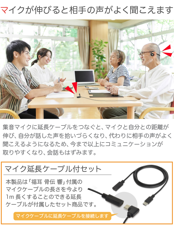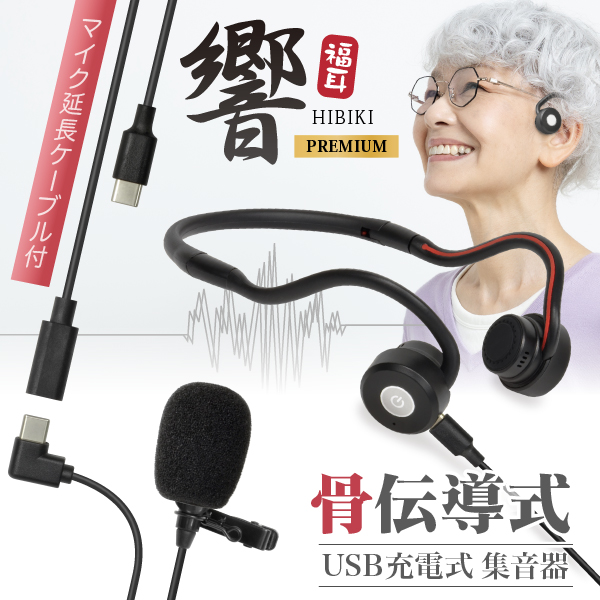 骨伝導 集音器 (マイク延長ケーブル付セット) 福耳 骨伝 響 PREMIUM USB充電式 Type-C マイクケーブルを+1m長くする延長ケーブル付属