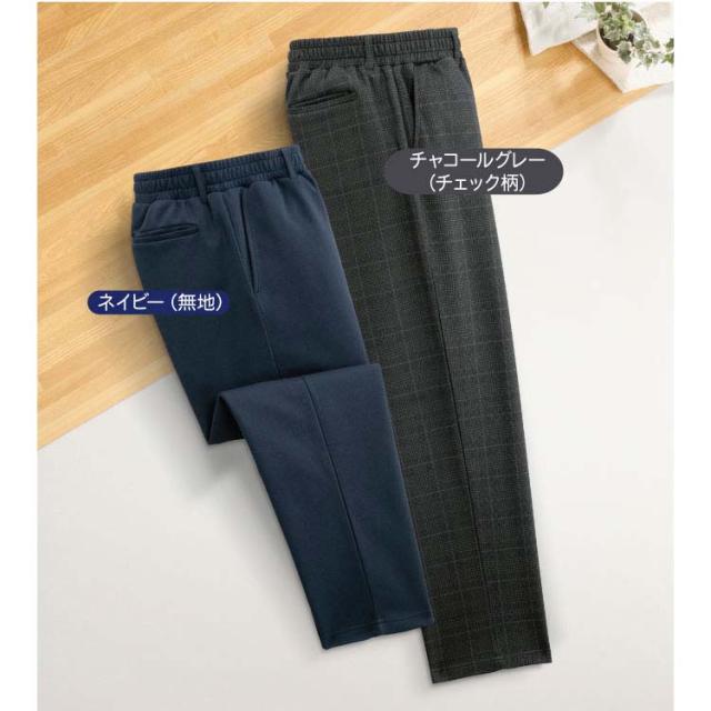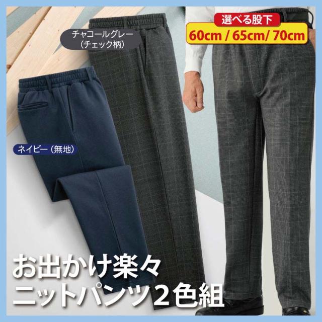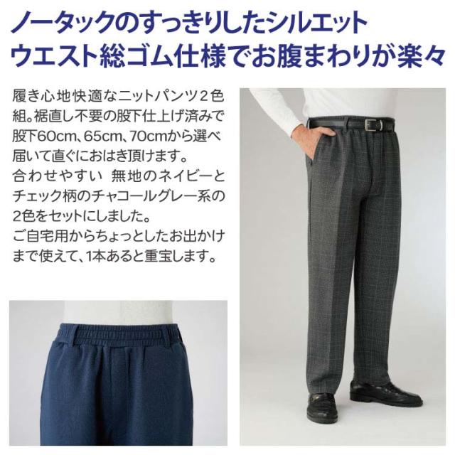 履き心地快適なニットパンツ2色組。ノータックのすっきりしたシルエット。ウエスト総ゴム仕様でお腹まわりが楽々快適。裾直し不要の股下仕上げ済みで股下60cm、65cm、70cmから選べ届いて直ぐにおはき頂けます。合わせやすい無地のネイビーとチェック柄のチャコールグレー系の2色をセットにしました。ご自宅用からちょっとしたお出かけまで使えて、1本あると重宝します。