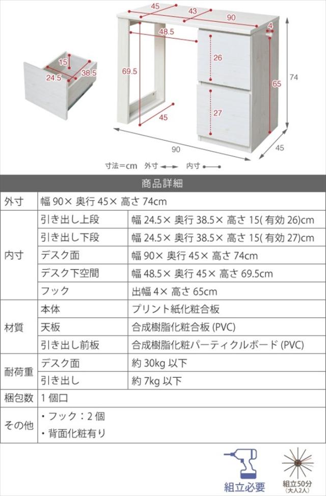 | □外寸 幅90×奥行45×高さ74cm □内寸 [引き出し上段]幅24.5×奥行38.5×高さ15(有効26)cm [引き出し下段]幅24.5×奥行38.5×高さ15(有効27)cm [デスク面]幅90×奥行45×高さ74cm [デスク下空間]幅48.5×奥行45×高さ69.5cm [フック]出幅4×高さ65cm |