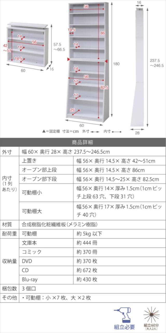 | □外寸 幅60×奥行28×高さ237.5〜246.5cm □内寸 [上置き]幅56×奥行14.5×高さ42〜51cm [オープン部上部]幅56×奥行14.5×高さ86cm [オープン部下部]幅56×奥行14.5〜25×高さ82.5cm [可動棚小]幅56×奥行14×厚み1.5cm(1cmピッチ上段63穴、下段31穴) [可動棚大]幅56×奥行17×厚み1.5cm(1cmピッチ40穴) |