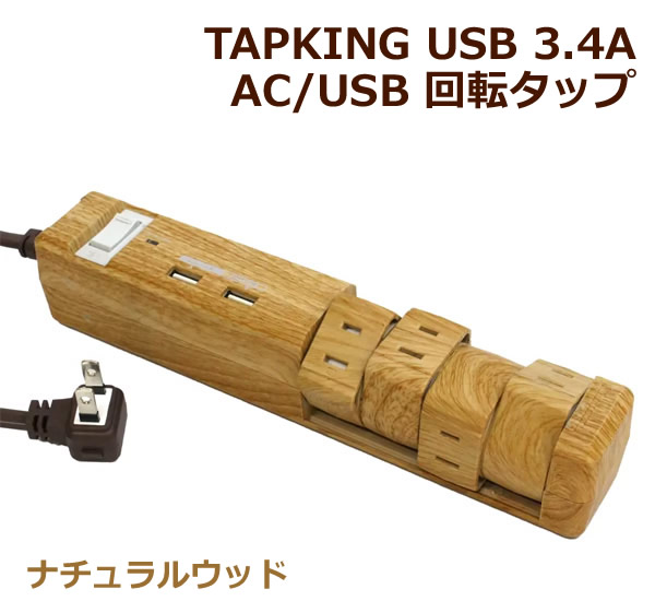 【送料無料】Fargo TAPKING USB3.4A 回転タップ ナチュラルウッド PT604BEWD AC/USB AC4個口 USB2ポート 電源タップ 延長コード コンセント ACアダプター 1.8m 急速充電 AC×4 USB×2 雷サージガード 一括電源スイッチ ファーゴ タップキング