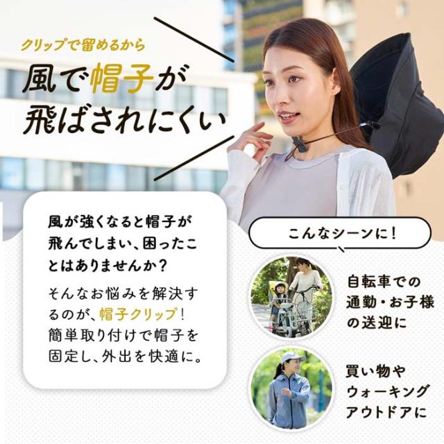 風の強い日や自転車でも安心!帽子が飛ばないクリップ!