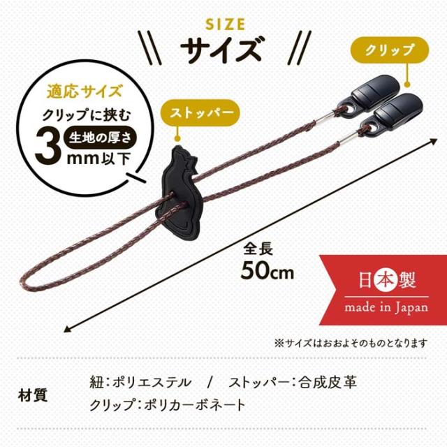 | 材質 | 紐/ポリエステル、ストッパー/合成皮革、クリップ/ポリカーボネート |