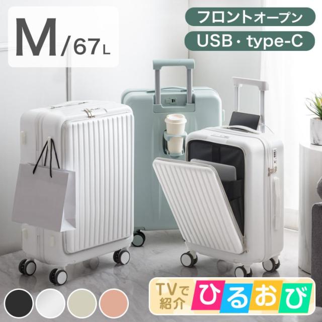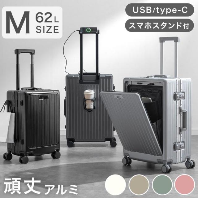 アルミフレーム 多機能 キャリーケース Mサイズ 62L フロントオープン アルミ 充電 USB type-c カップホルダー スマホスタンド キャリーバッグ スーツケース 旅行