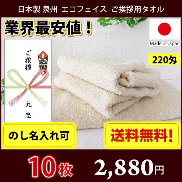 【送料無料】小口 10枚セット 引っ越し ご挨拶用タオル(のし紙名入れ) 日本製 泉州 無蛍光・無漂白 エコ 220匁 フェイスタオル