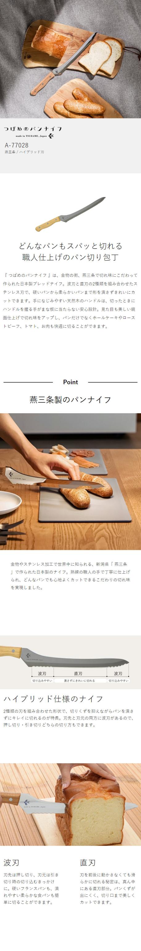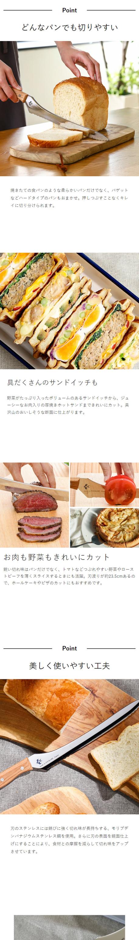 どんなパンもスパッと切れる 職人仕上げのパン切り包丁 『 つばめのパンナイフ 』は、金物の街、燕三条で切れ味にこだわって作られた日本製ブレッドナイフ。波刃と直刃の2種類を組み合わせたステンレス刃で、硬いパンから柔らかいパンまで形を潰さずきれいにカットできます。手になじみやすい天然木のハンドルは、切ったときにハンドルを握る手がまな板に当たらない安心設計。見た目も美しい鏡面仕上げで切れ味をアップし、パンだけでなくホールケーキやローストビーフ、トマト、お肉も快適に切ることができます。
