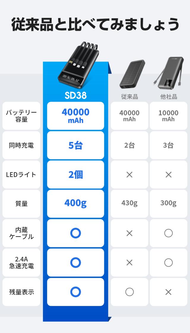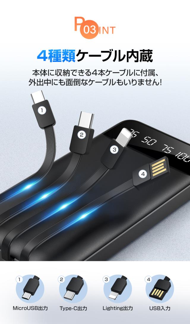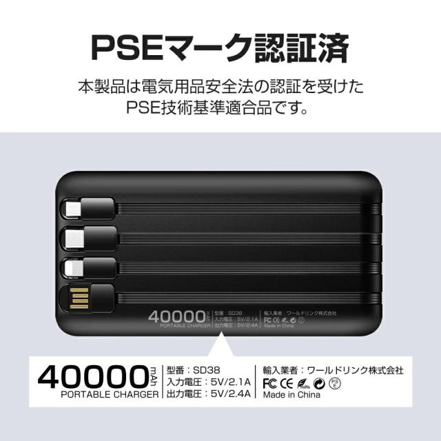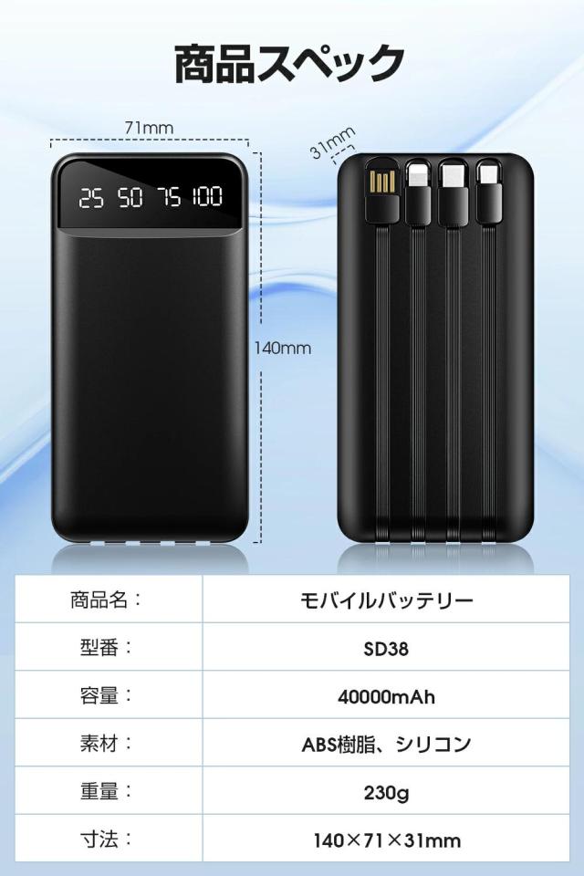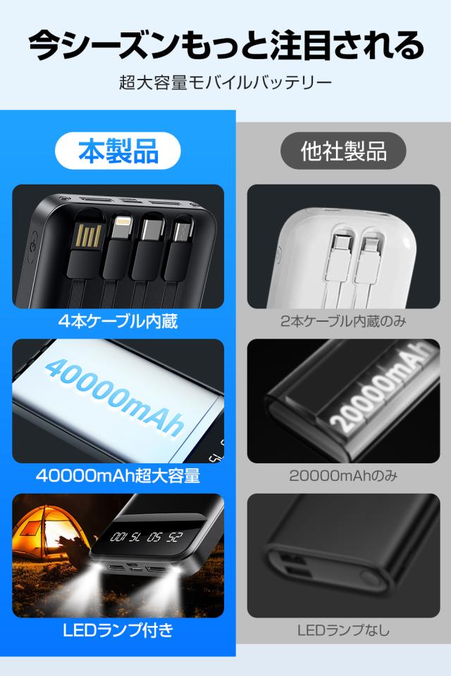 40000mAh大容量 4本ケーブル内蔵 モバイルバッテリー 大容量 急速充電 led残量表示 ledライト付き 5台同時充電 モバイルバッテリー